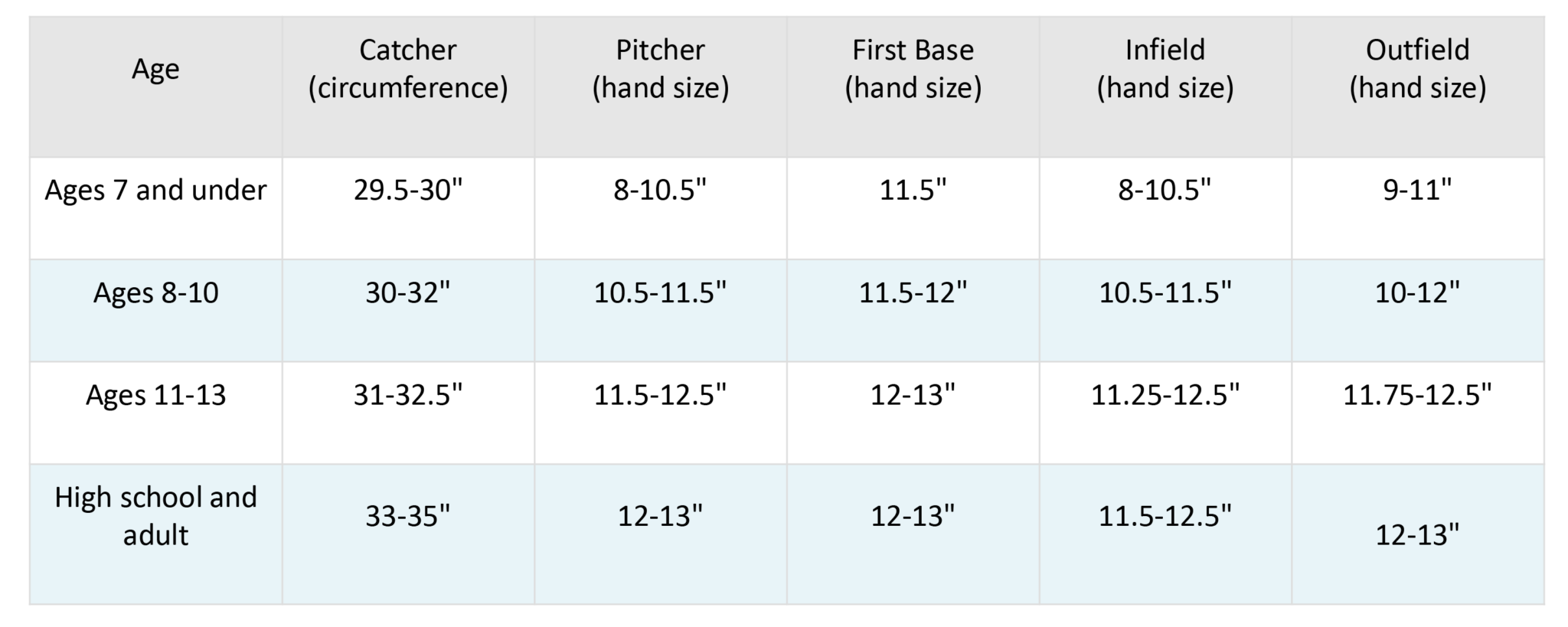 Catcher’s mitts will have the largest circumference, while first baseman’s mitts are the longest. Infielders will want a shorter length for ease of transferring the ball from their glove to their hand.